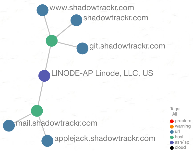 Network graphs are visual representations of your hosts and urls. They show how your assets are related. Graphs allow you to instantly spot where your problems are and can contain thousands of nodes. Here's a small example: